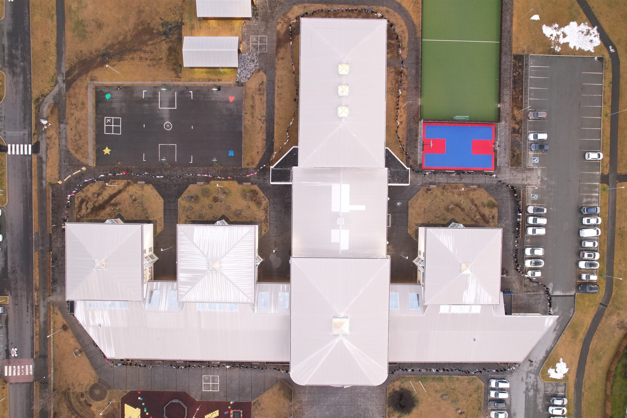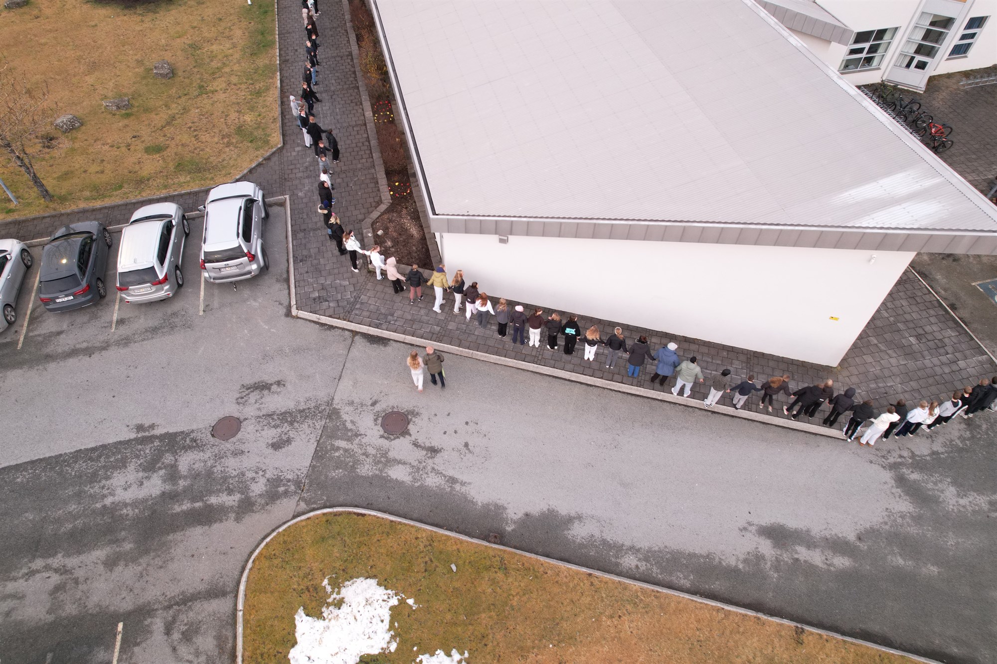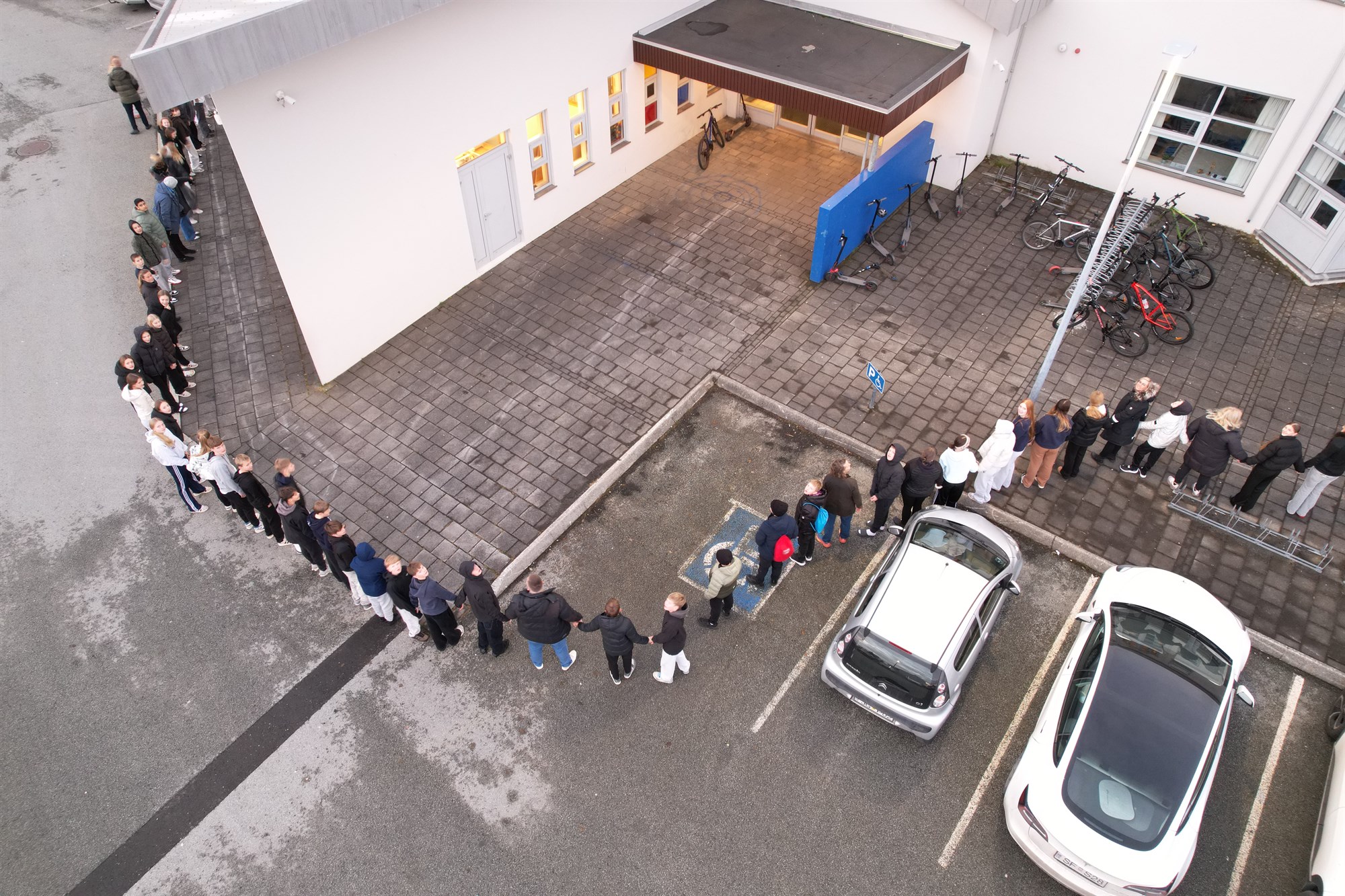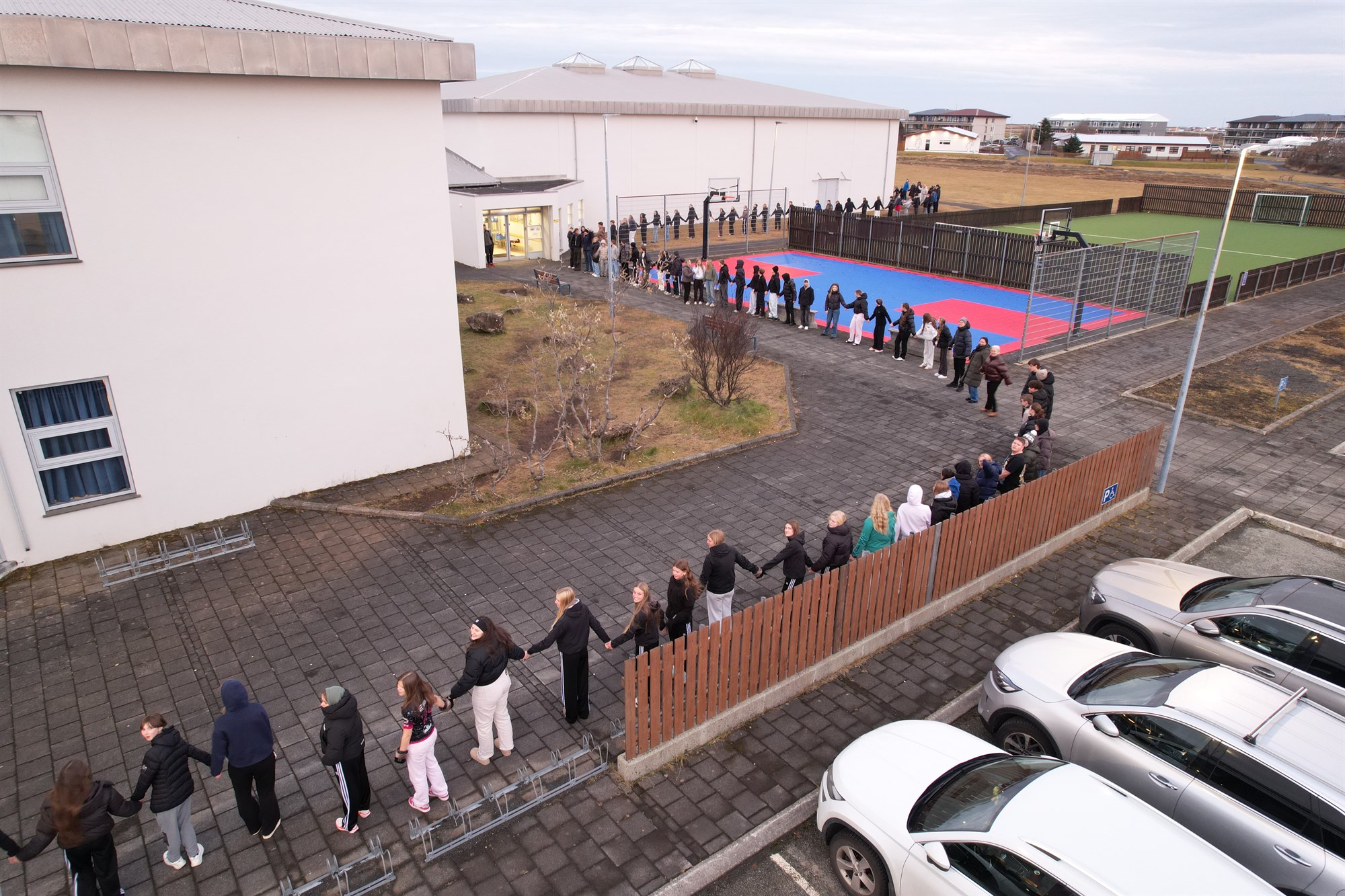 Dagurinn hófst á því að kennarar útskýrðu markmið dagsins og síðan fóru allir út til að knúsa skólann. Nemendur tóku höndum saman og mynduðu hring utan um skólann, falleg táknmynd samstöðu og vináttu. Að lokinni knúslotu klöppuðum við hátt til að sýna þátttöku og einingu.